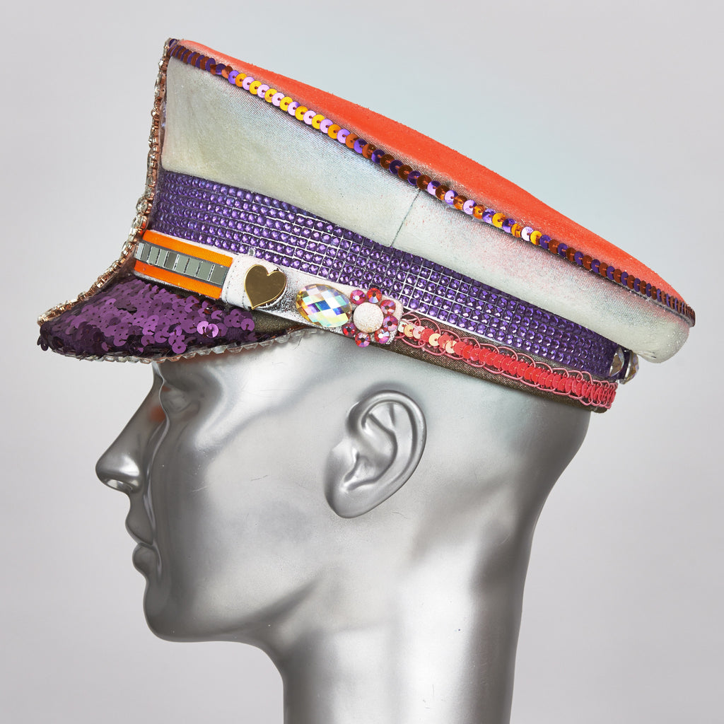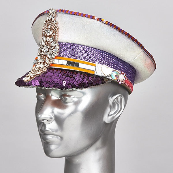 Original army issue wool military dress hat sprayed white then finished with opalescent holographic powder. embellished with sequins, glitter, fluoro yellow paint, reflective tape, large crystal motif, fluorescent crystals, mirror pieces, foam and love. this is a one off hand made piece of wearable art. it takes around A WEEK to complete one of these pieces. please order as you would like it.