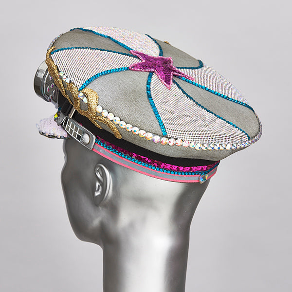 With the addition of psychedelic kaleidoscopic goggles! Original Aussie army issue dress hat. Embellished with sequins, silver glitter paint, glitter, gold & ____AB crystals, reflective ribbon tape, gold embroidery, aqua/green mirror square tiles, foam and LOVE. This certainly IS the only one like it on the entire planet. Looks sick under lights or in broad daylight. It is a one off hand made piece of wearable art. It takes around 3 days to complete one of these babies. Please order as you would like it. (colours etc)