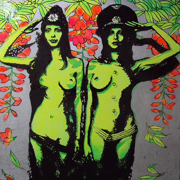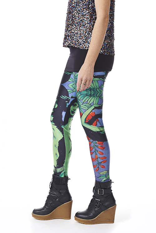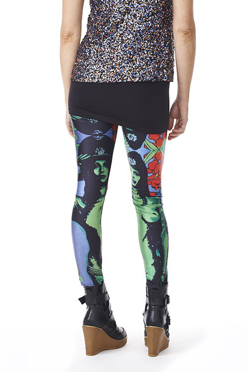 One of Inglet Von Singlets original artworks on leggings! A pair of saluting green female nudes against a silver leaf backdrop surrounded by luscious vibrant red wisteria flowers and leaves. Bring out the fun and cheeky you or others! Can be worn in so many ways with so many colours. Men look fab in these too - great for festivals.