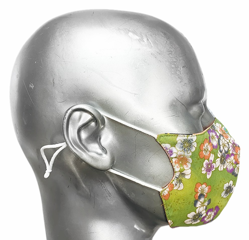 Side one of this mask is a beautiful Japanese cotton with traditional styled cherry blossoms in shades of green, orange and mauve - the other side has a hand dyed retro neon orange and black Bowie inspired lightning bolts pattern. There are 8 of these available in a size S. If you are a larger size and would like one, we are happy to make one specially to order.