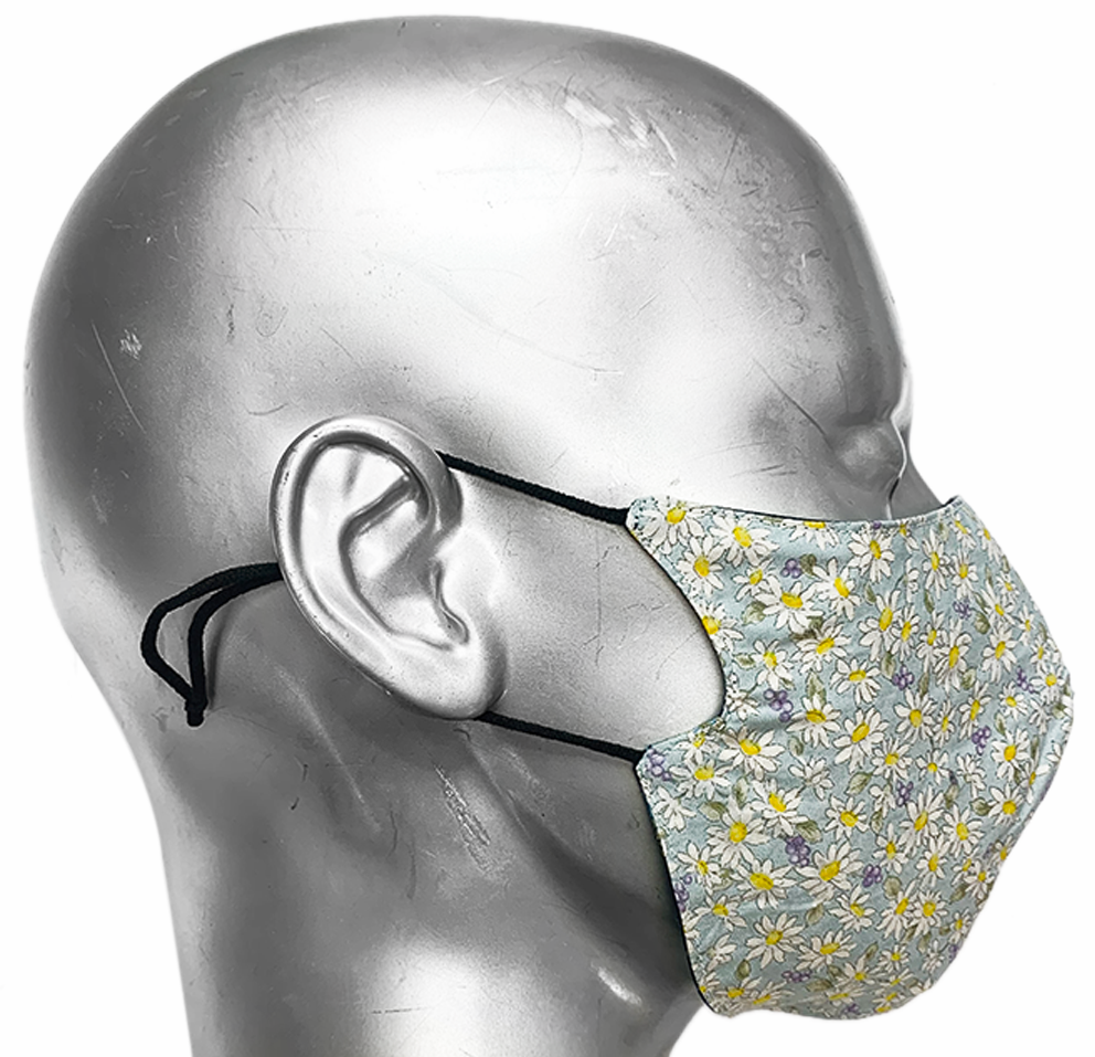 Side one of this mask a traditional old style tattoo illustration of Japanese koi fish swimming in deep blue seas - the other side is a gorgeous print of tiny white daisies on a baby blue/grey background of fine Japanese cotton. There are 7 of these available in a size M. If you are a different size and would like one, we are happy to make one specially to order.