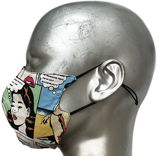 One side of this mask depicts an Australian Aboriginal art pattern in black and white - the other side has a 1960's retro pop art print of women and sewing themed mishaps. There are 5 of these available all in a size M.