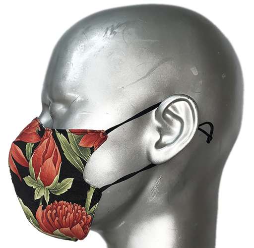 One side of this mask is covered in the Australian native flower - the red warratah, the other side has a print of black and white skulls. There are 3 of these available all in a size S.