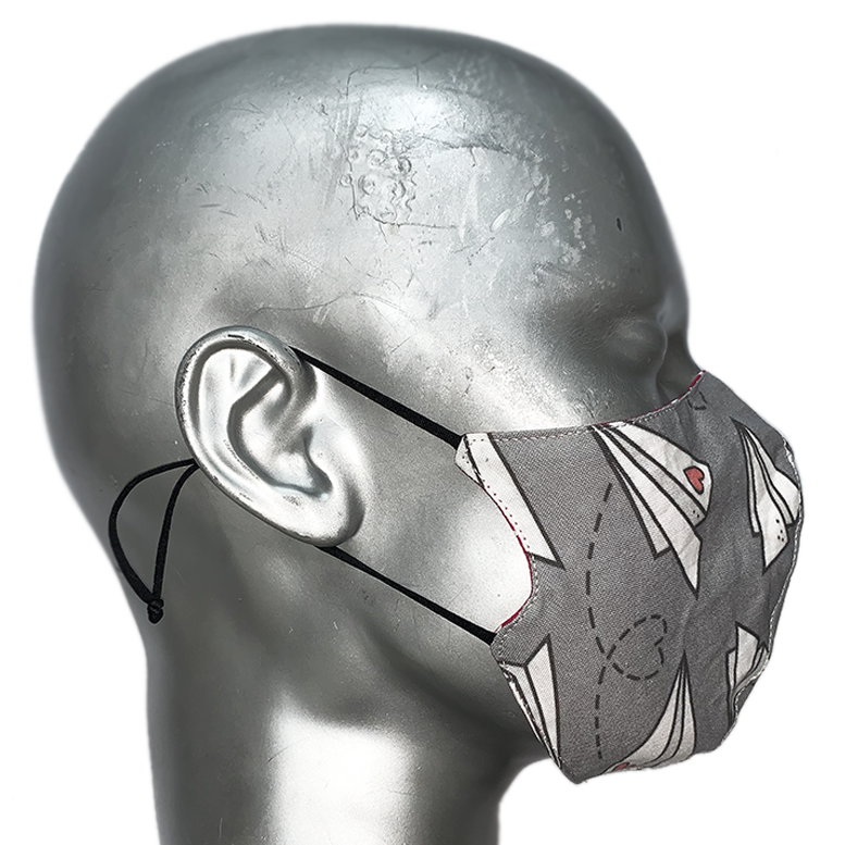 PS: The silver head these were photographed on is a size small, so masks which are bigger in size will look larger than they should. Please look at the sizing table to choose your correct size. Also, with non-symmetrical prints (like the love letters design), each mask will be slightly different *original* in print due to the haphazard placement of the paper planes.