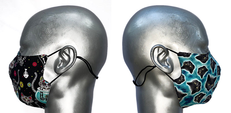 This mask has a litter of black cats heads against a blue sky on one side, and cute kitty skeletons in the day of the dead style on the other. Show your love of cats with this mask. THIS DESIGN ONLY AVAILABLE IN SIZE LARGE